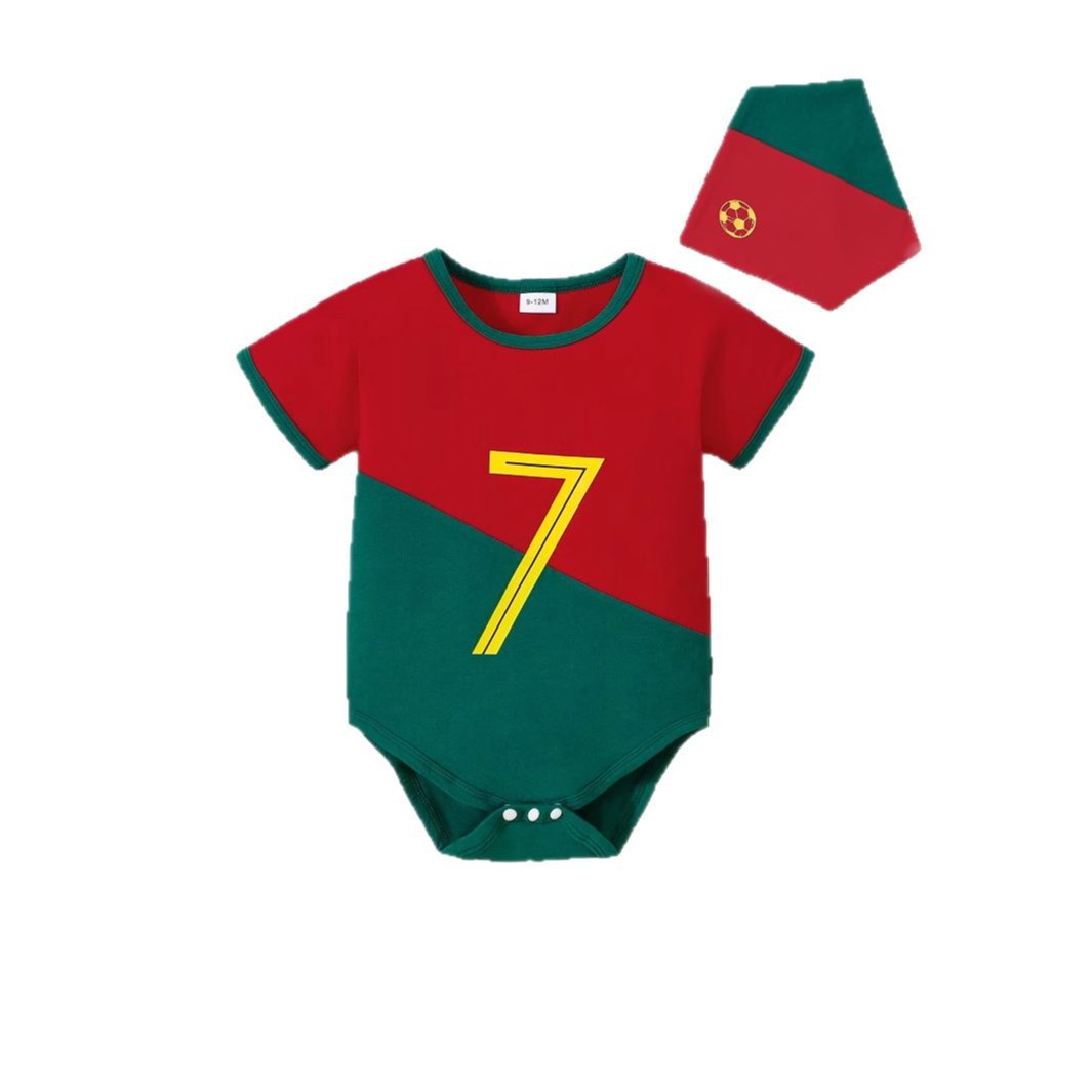 夏季婴幼儿连体衣三角哈衣+头巾撞色足球7号字母烫图透气棉短袖