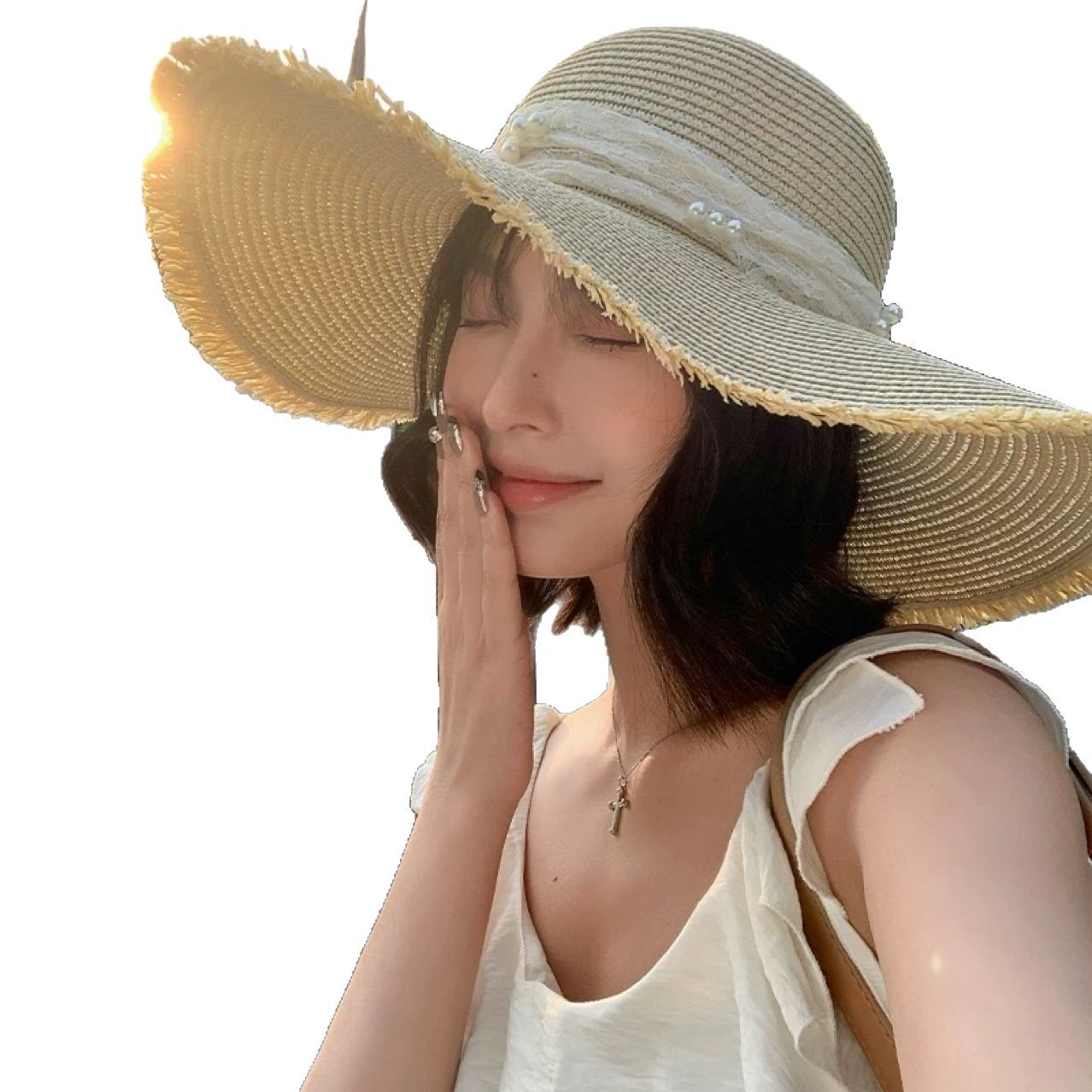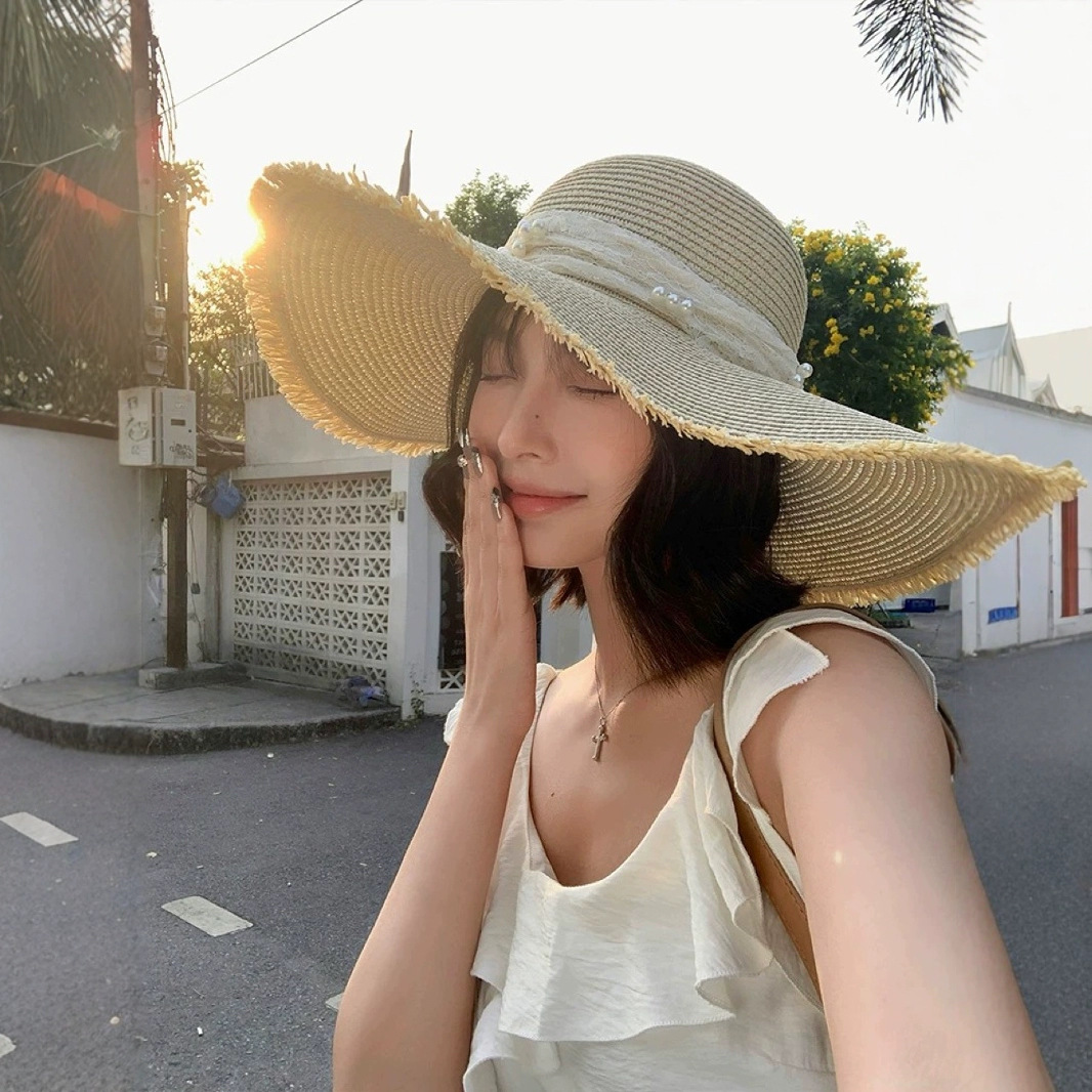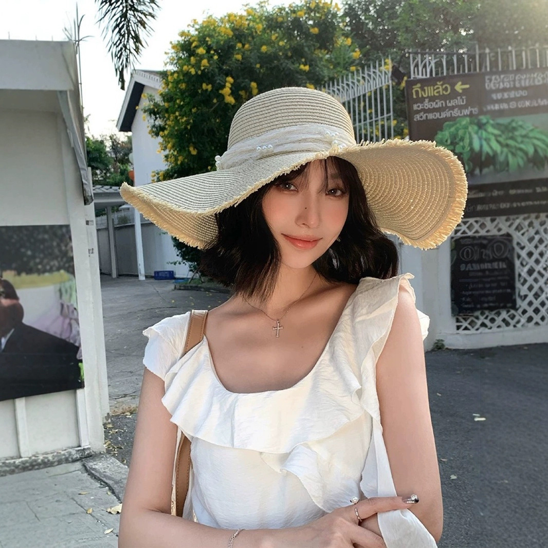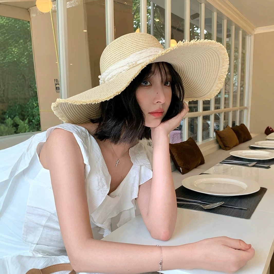 大帽檐蝴蝶结珍珠草帽女款夏季海边沙滩遮阳防晒帽度假太阳帽子潮