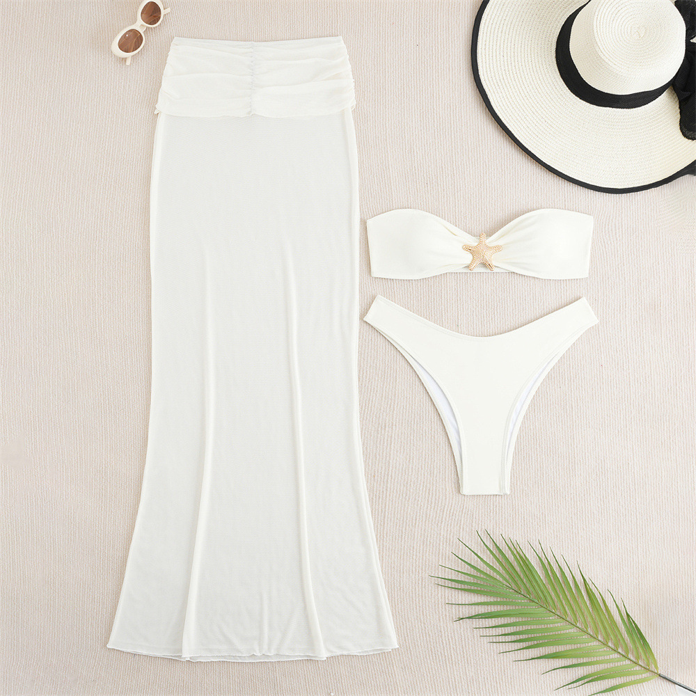 2025欧美跨境性感比基尼长裙三件套泳衣新款夏季海星低腰白色泳装