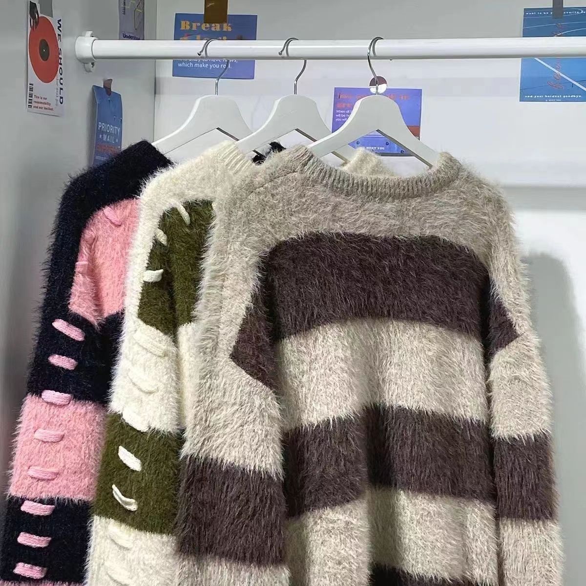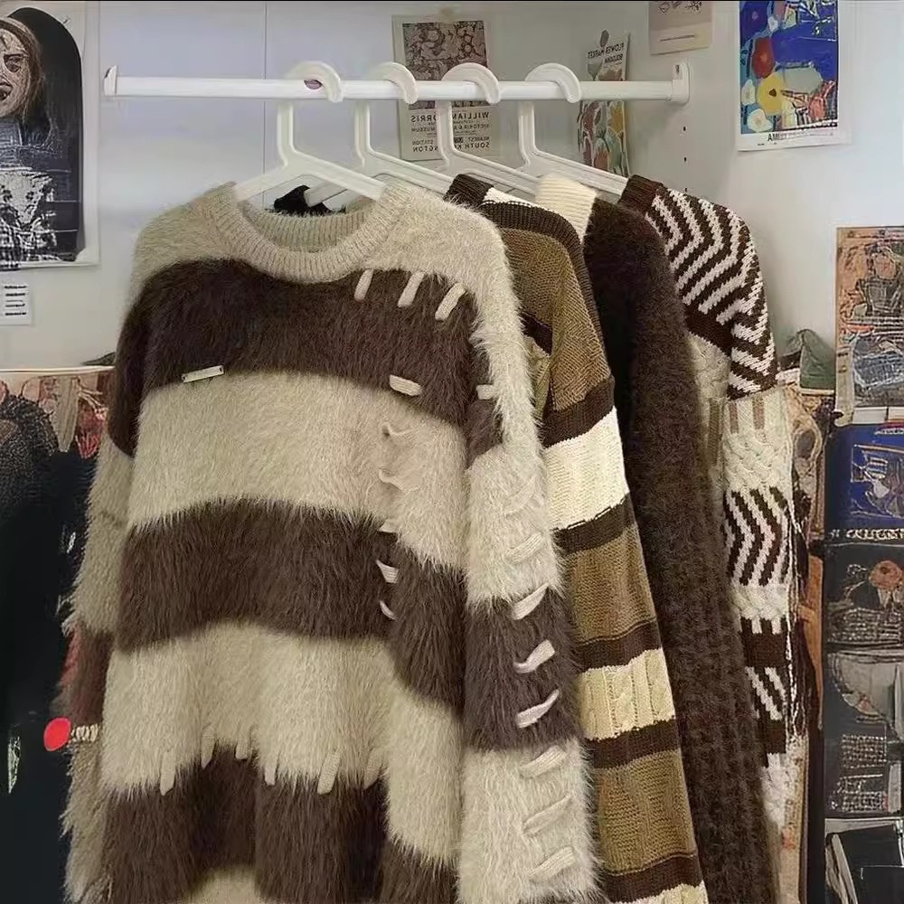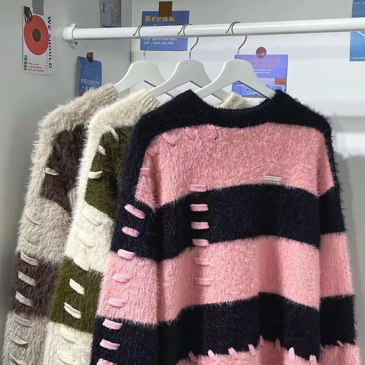 软糯仿水貂绒条纹撞色毛衣女秋冬宽松设计感小众慵懒风针织衫上衣