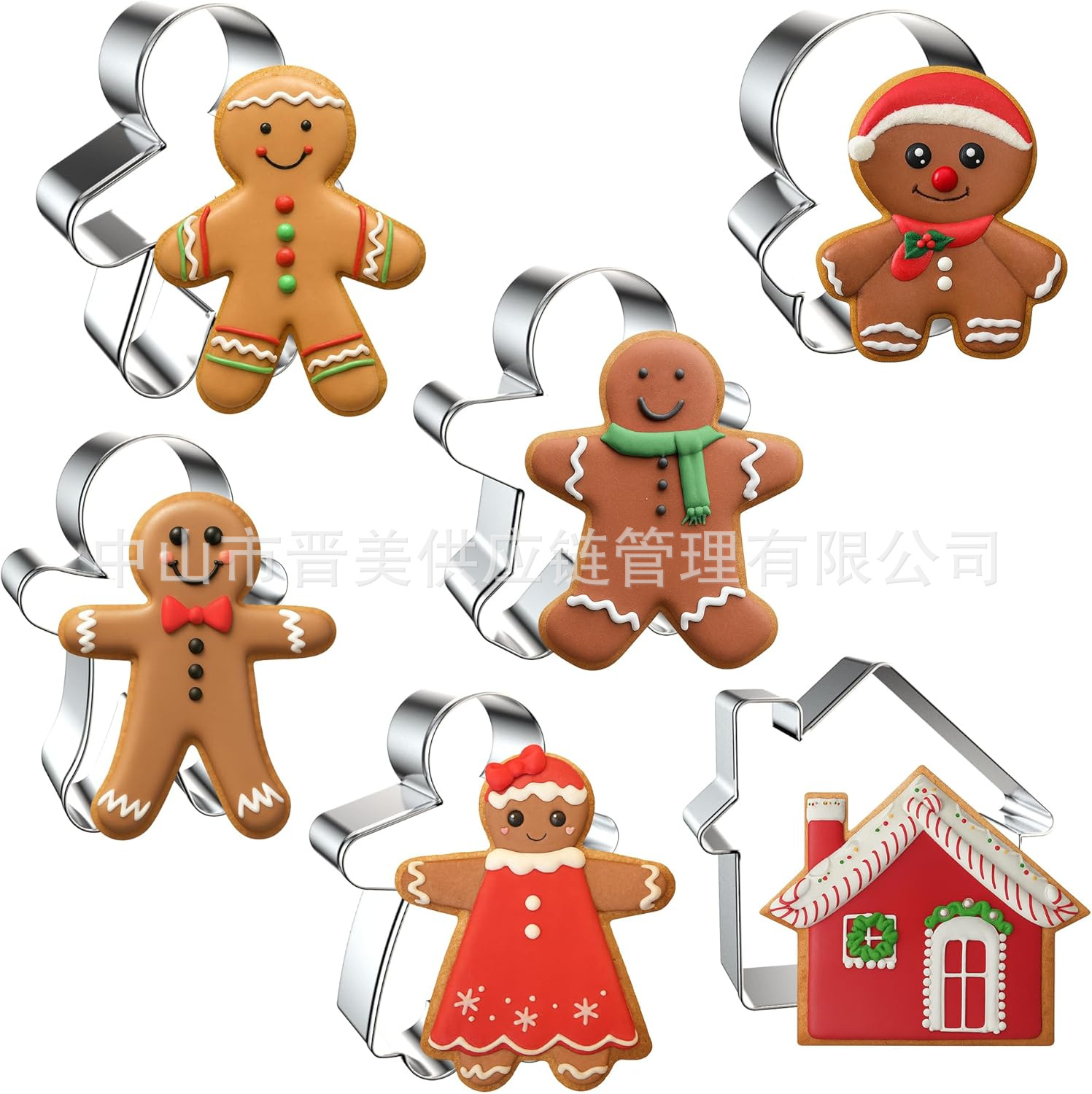 跨境专供圣诞节不锈钢姜饼屋模具套装 7件一体按压式烘焙工具
