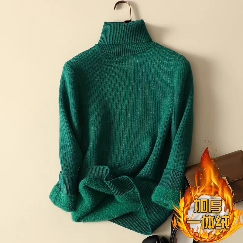 一体绒针织衫两翻领加绒打底衫女韩版新款百搭小个子套头加厚毛衣