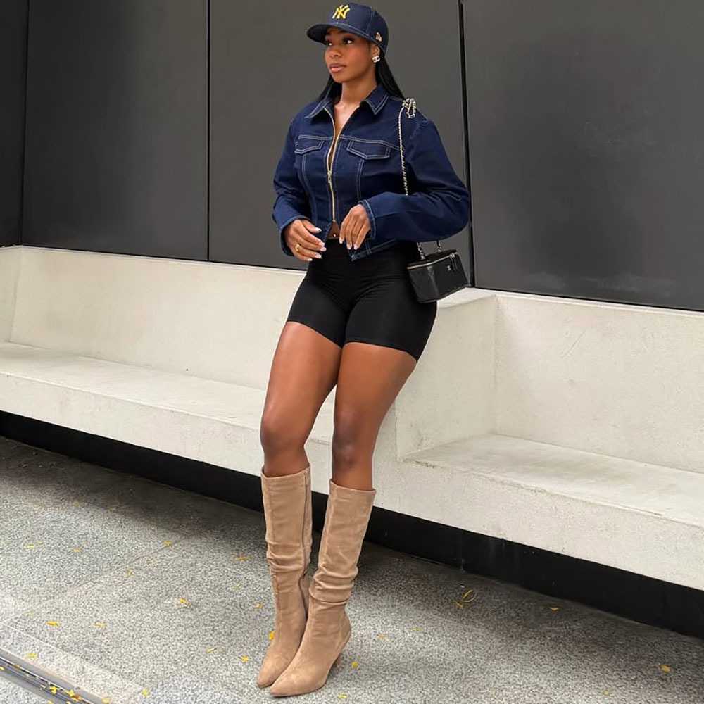 欧美女式休闲牛仔外套 亚马逊跨境女装街头时尚翻领长袖短款夹克