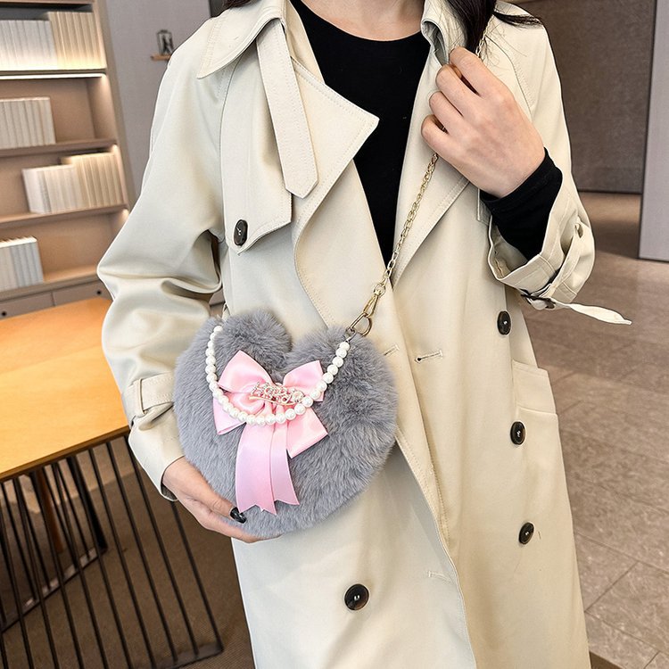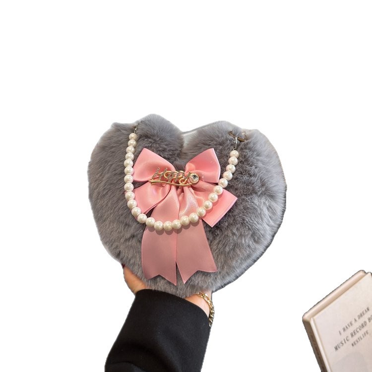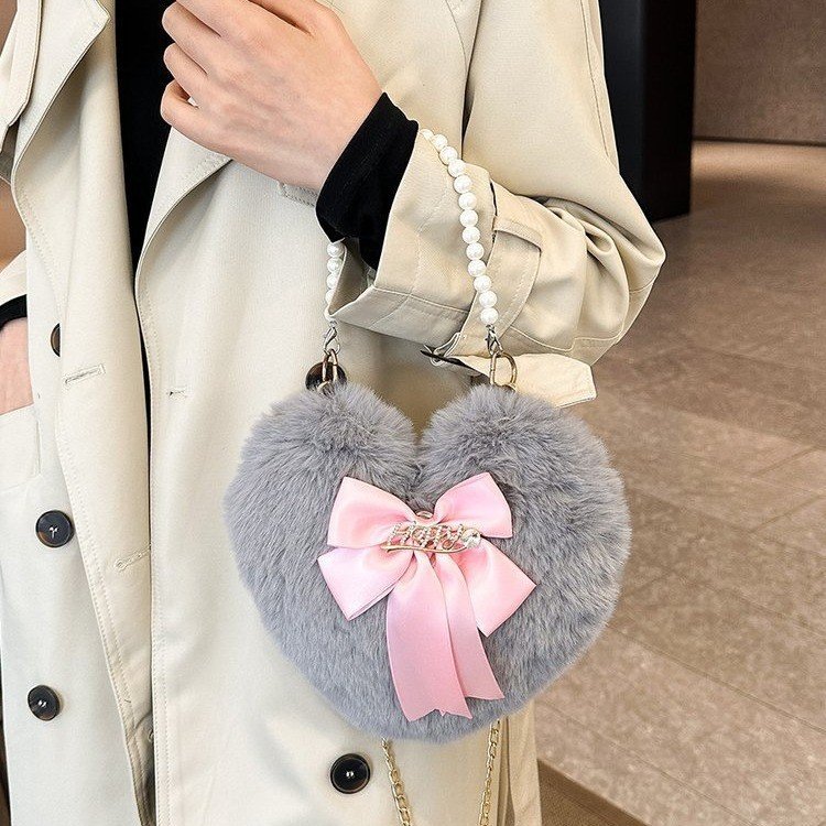 秋冬毛绒包2025新款森系甜美少女蝴蝶结百搭珍珠手提包斜挎爱心包