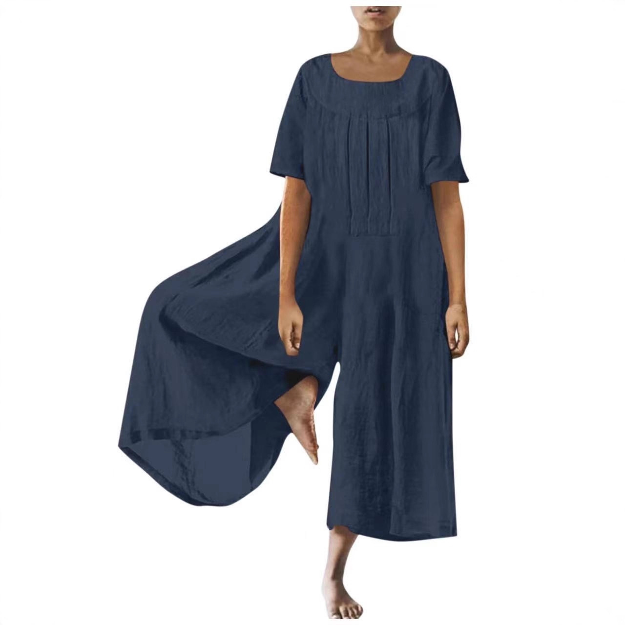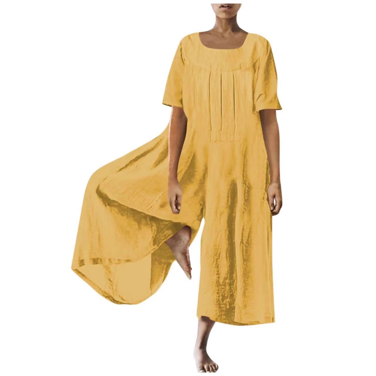 跨境外贸新款亚马逊外贸时尚休闲女装 宽松纯色棉麻短袖连体裤女