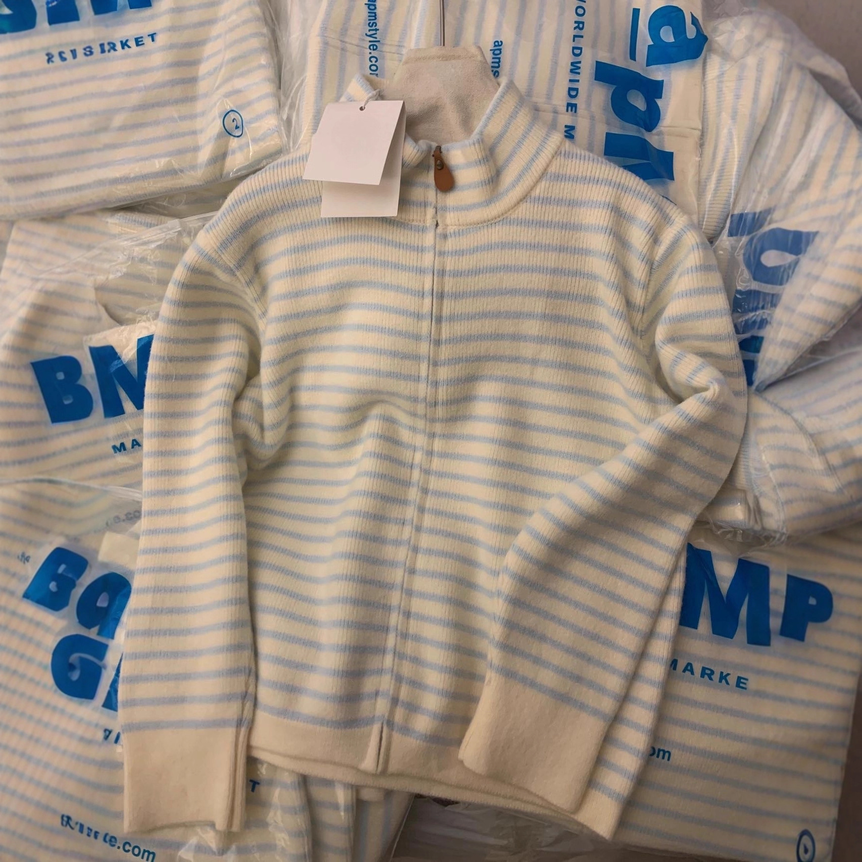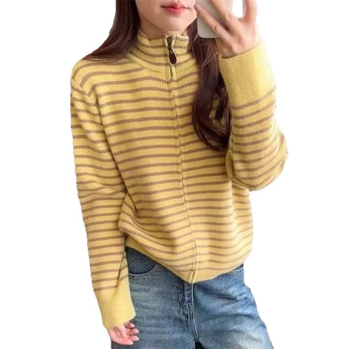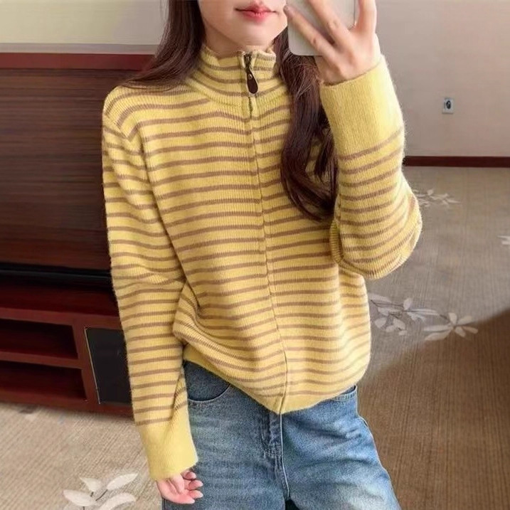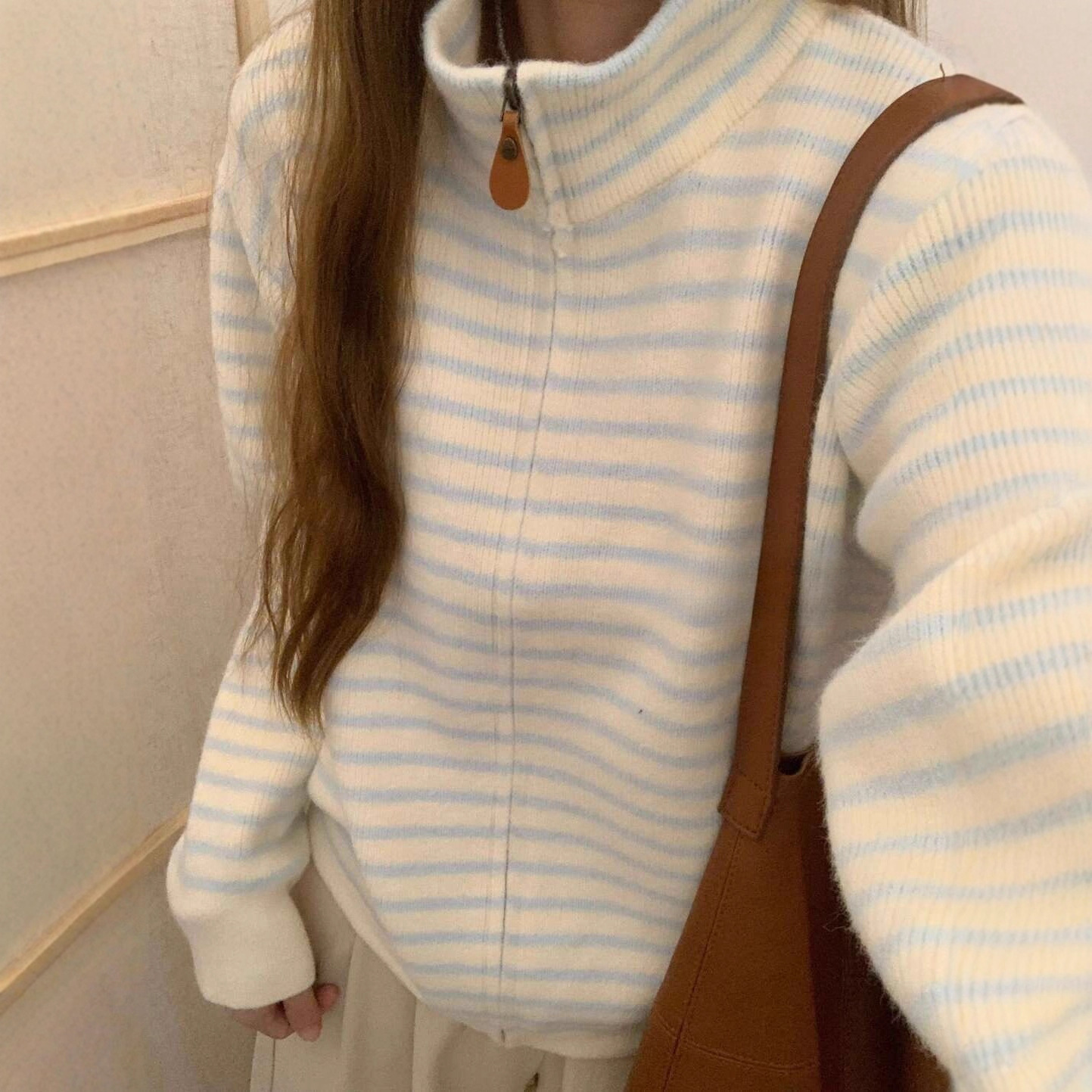 秋冬韩系拉链设计感立领内搭毛衣上衣蓝白条纹撞色针织开衫外套女