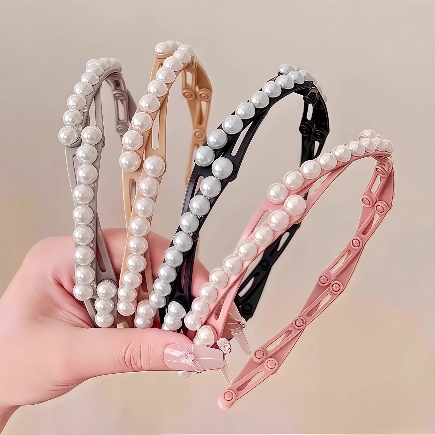 颜色 | 珍珠折叠发箍黑色+灰色【2个装】 | | 颜色 | 珍珠折叠发箍粉色+卡其【2个装】 |