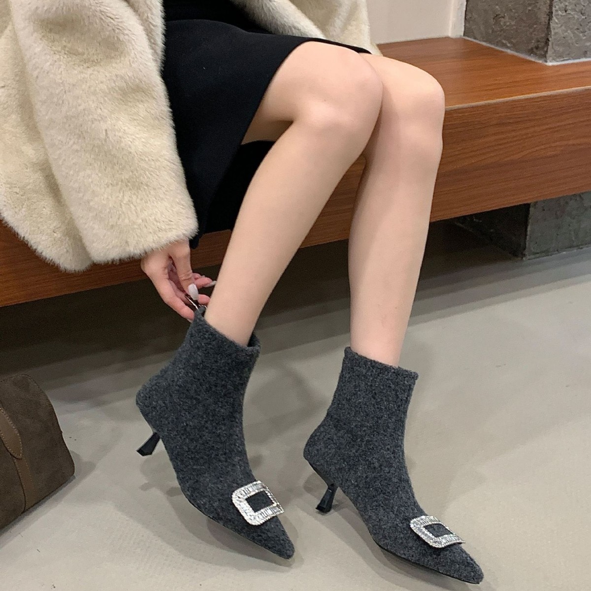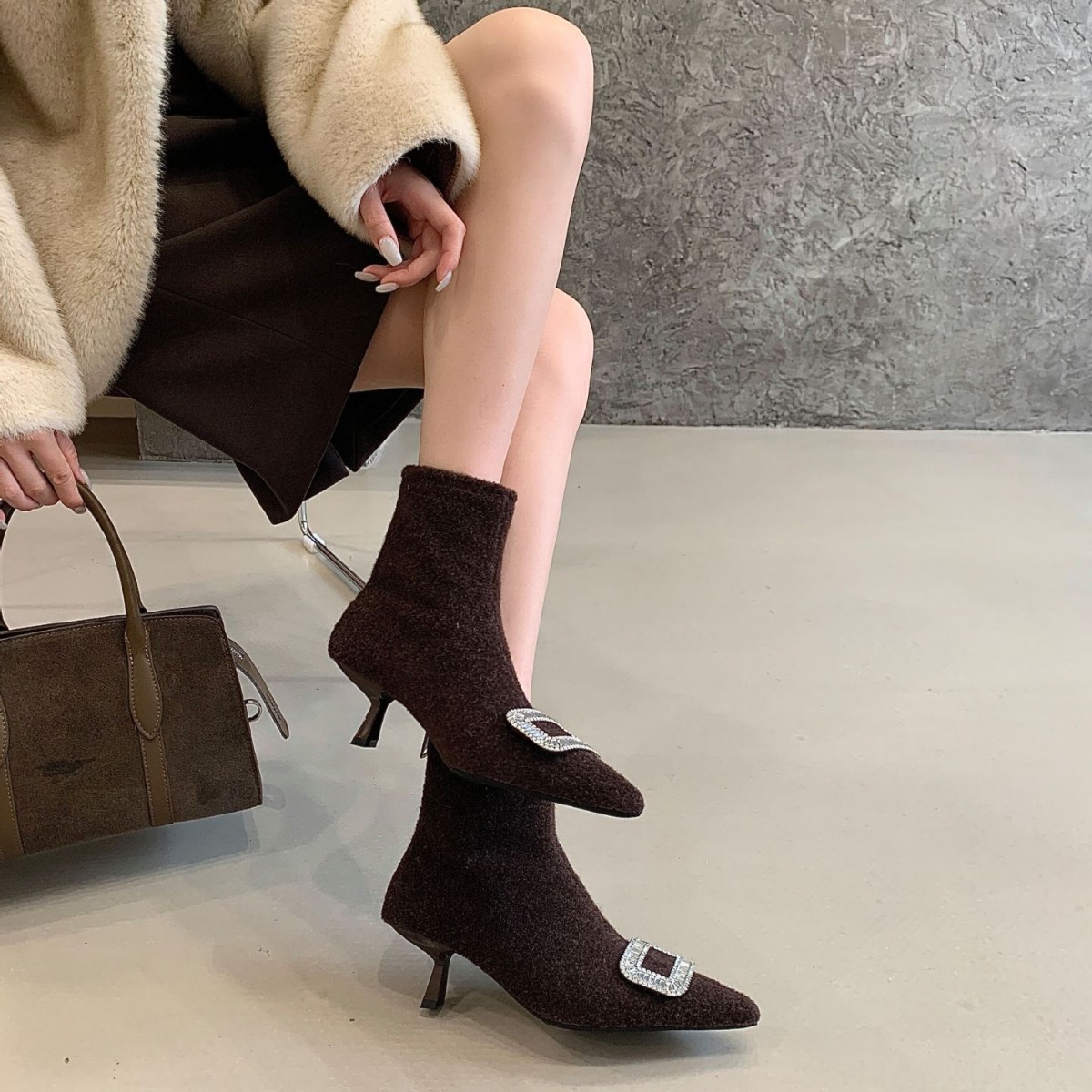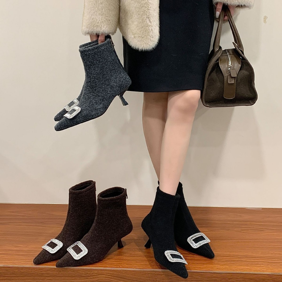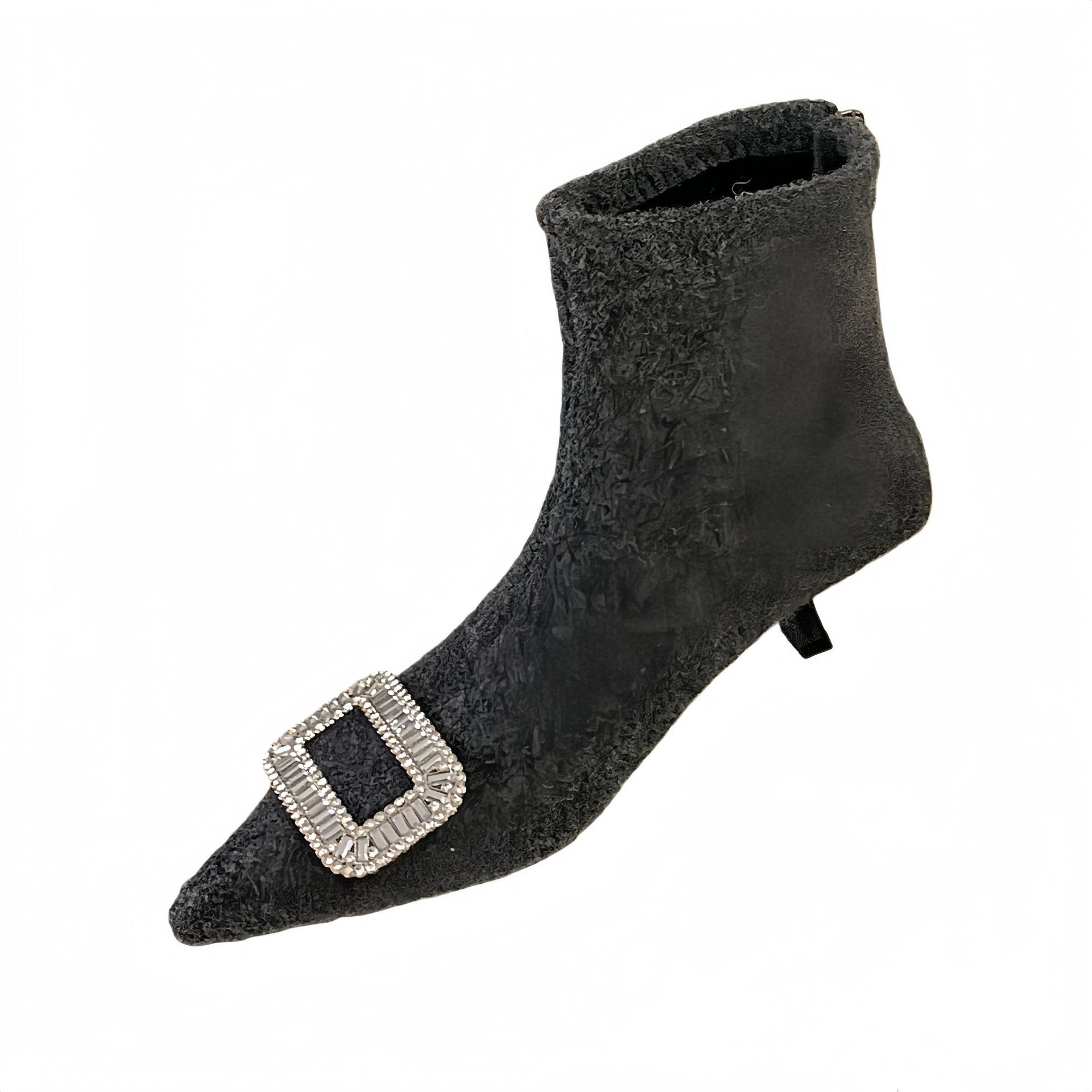 轻奢时尚女短靴2025冬季新款尖头水钻扣后拉链绒面低筒瘦瘦马丁靴