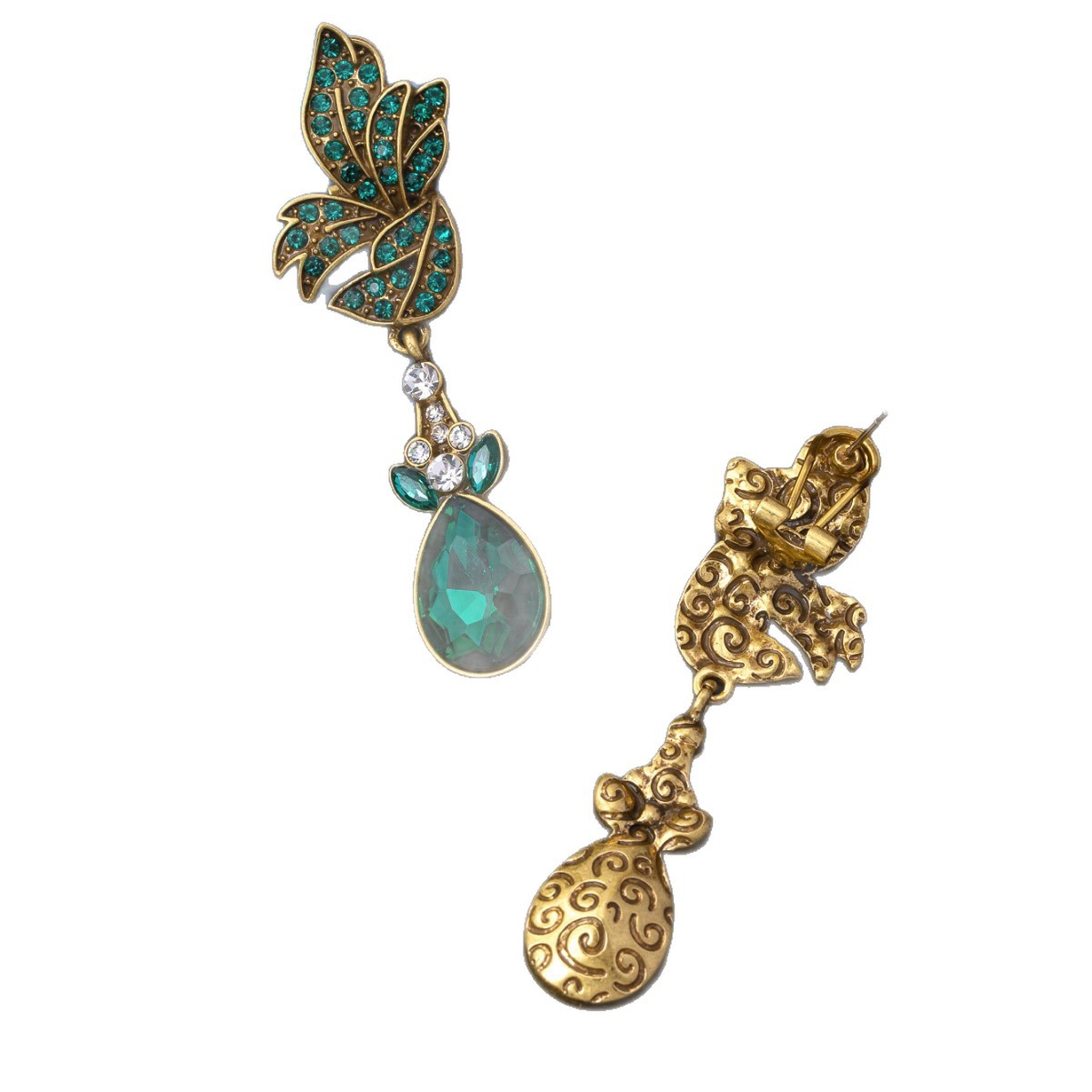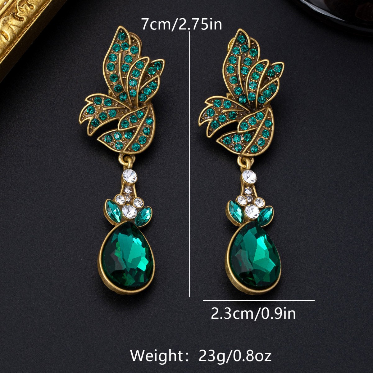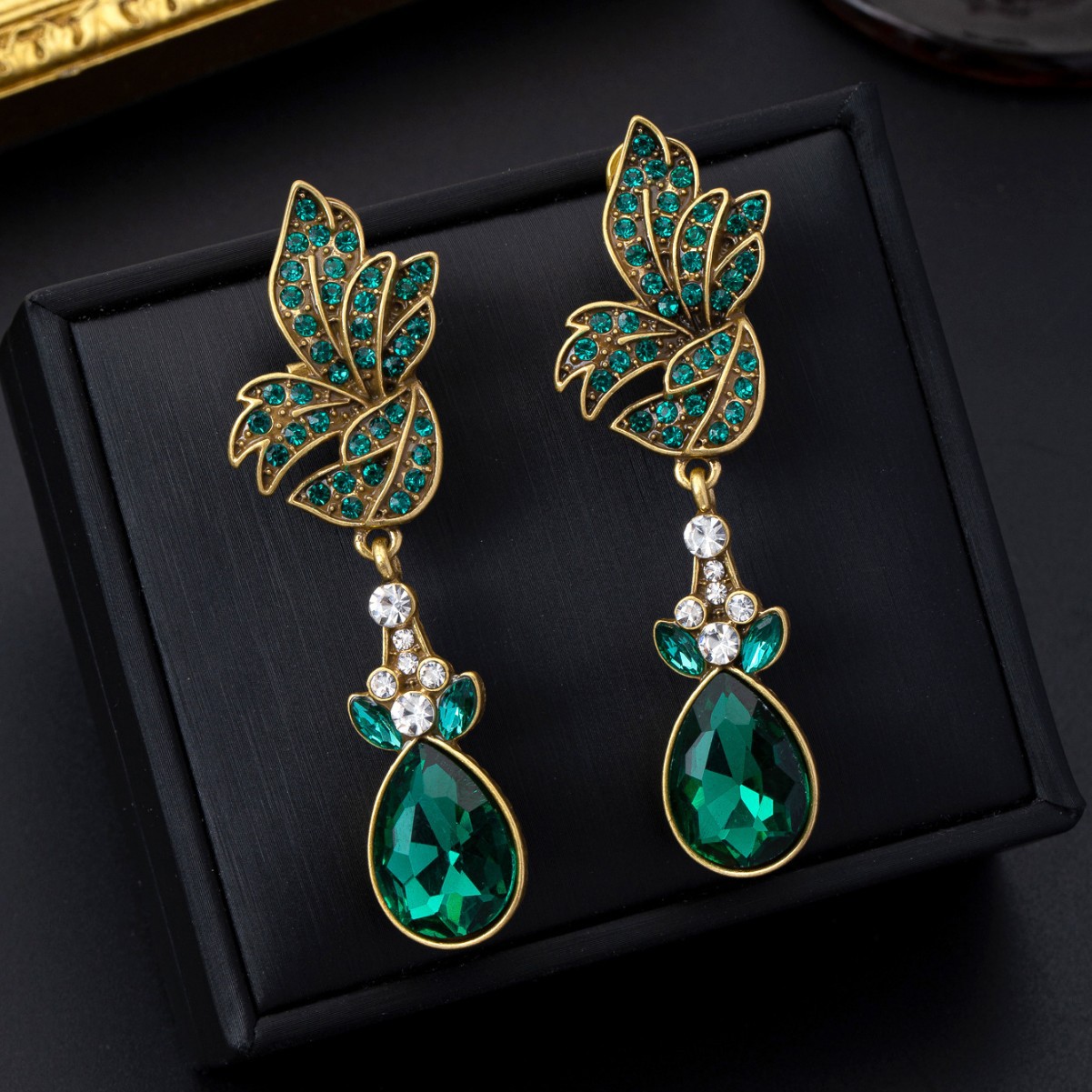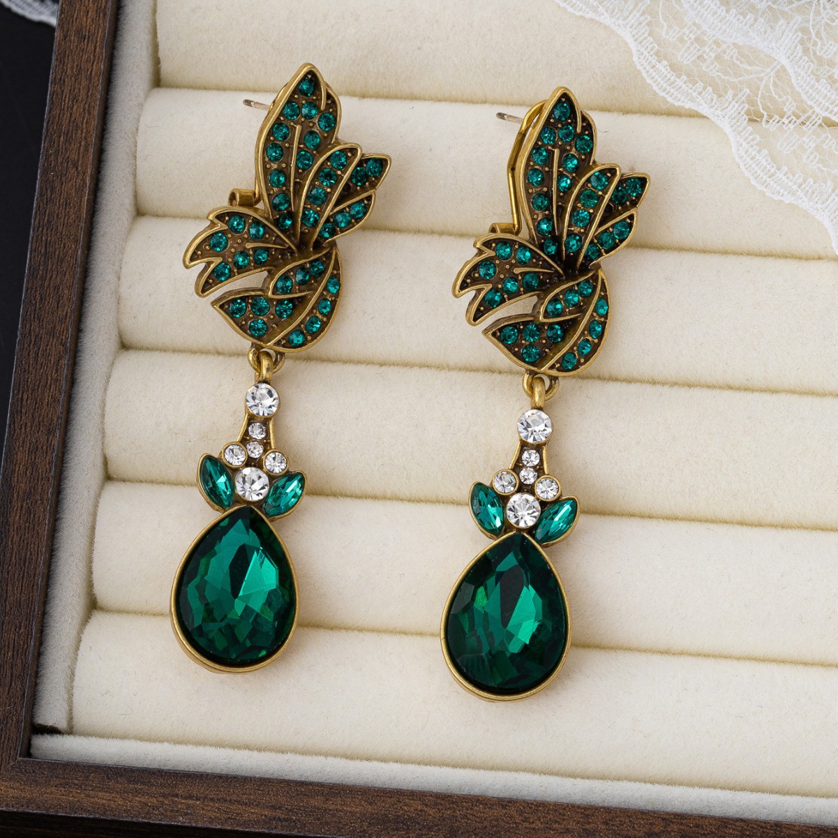 中古vintage树叶祖母绿耳钉复古宫廷轻奢耳饰小众文艺镶钻