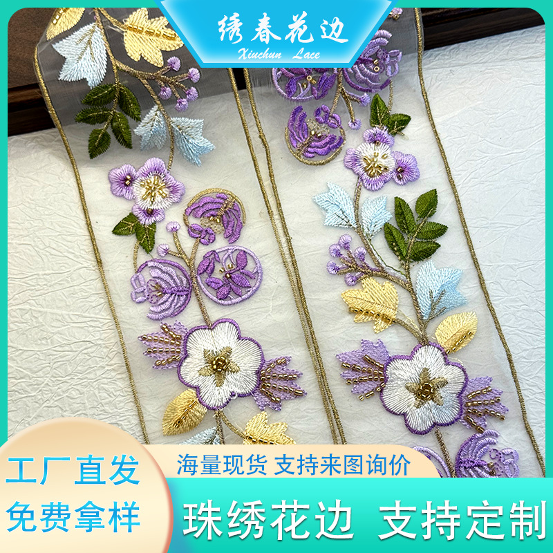 紫调花卉刺绣花边汉服旗袍领口裙摆装饰花边轻奢金丝网纱绣花辅料