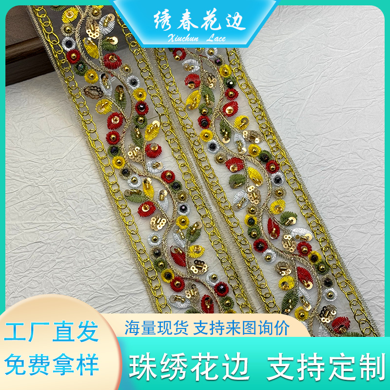 民族风手工钉珠花边 服装辅料领口袖口装饰彩色亮片网纱刺绣条码