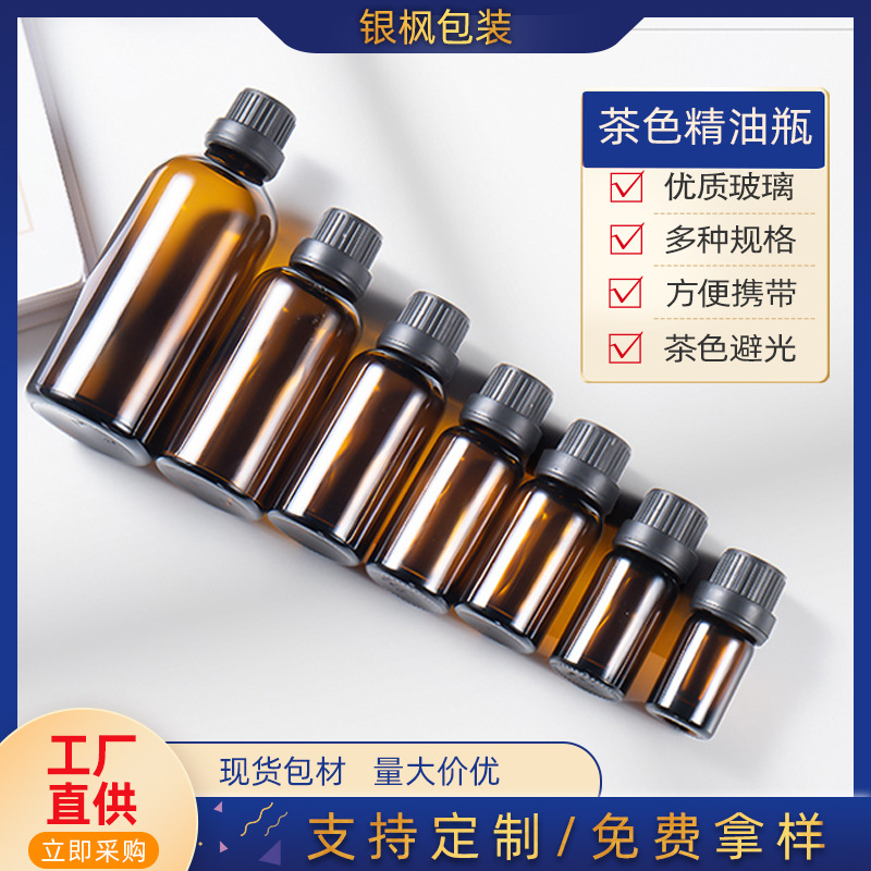 现货供应茶色精油瓶 5ml-100ml棕色精油瓶 内塞大头盖 黑色防盗