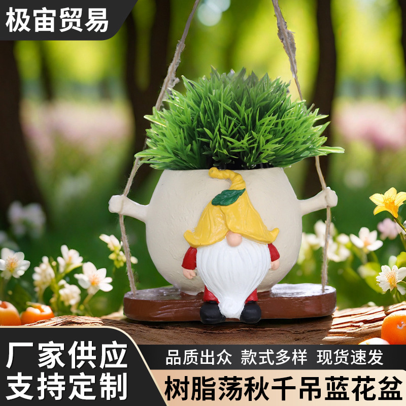 新款创意开心侏儒荡秋千悬挂吊蓝花盆户外花园庭院装饰树脂工艺品
