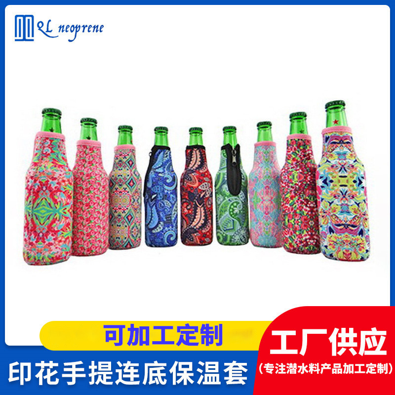 厂家直供潜水料拉链啤酒瓶套 户外便携保温印花RPET连底瓶套