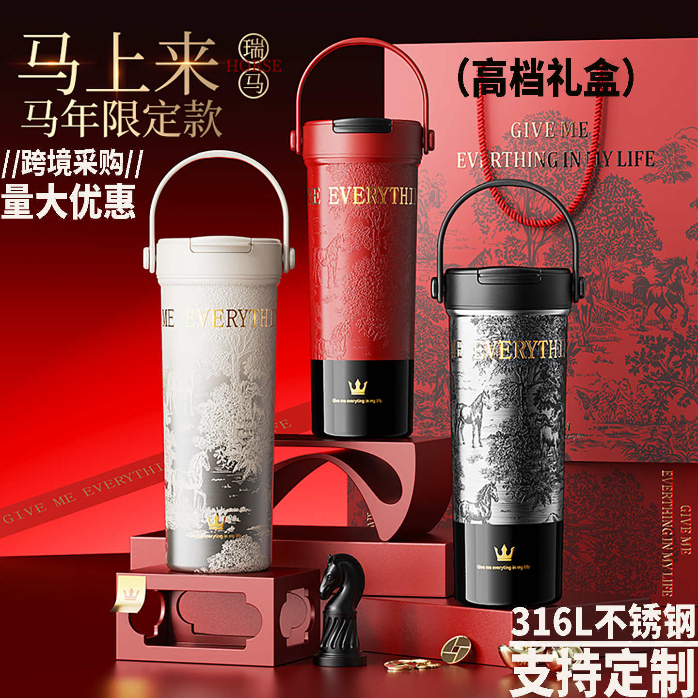 跨境手提马年红色保温杯女生高颜值2026本命年礼物吸管水杯子刻字