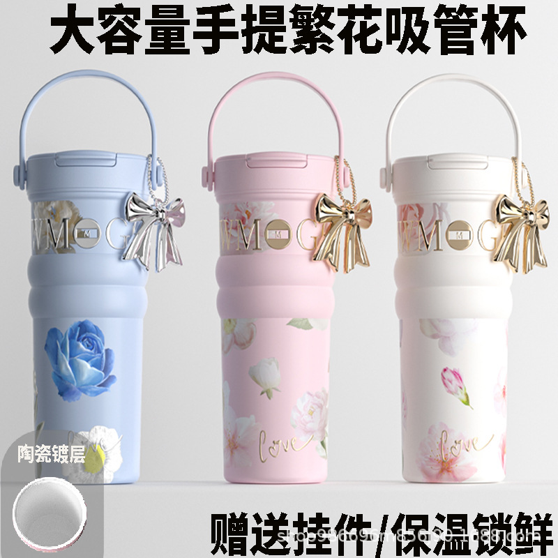 繁花手提保温杯女士高颜值2026新款陶瓷内胆吸管咖啡杯随行水杯子