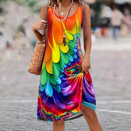 2025大码跨境亚马逊欧美夏季彩虹印花无袖女士连衣裙