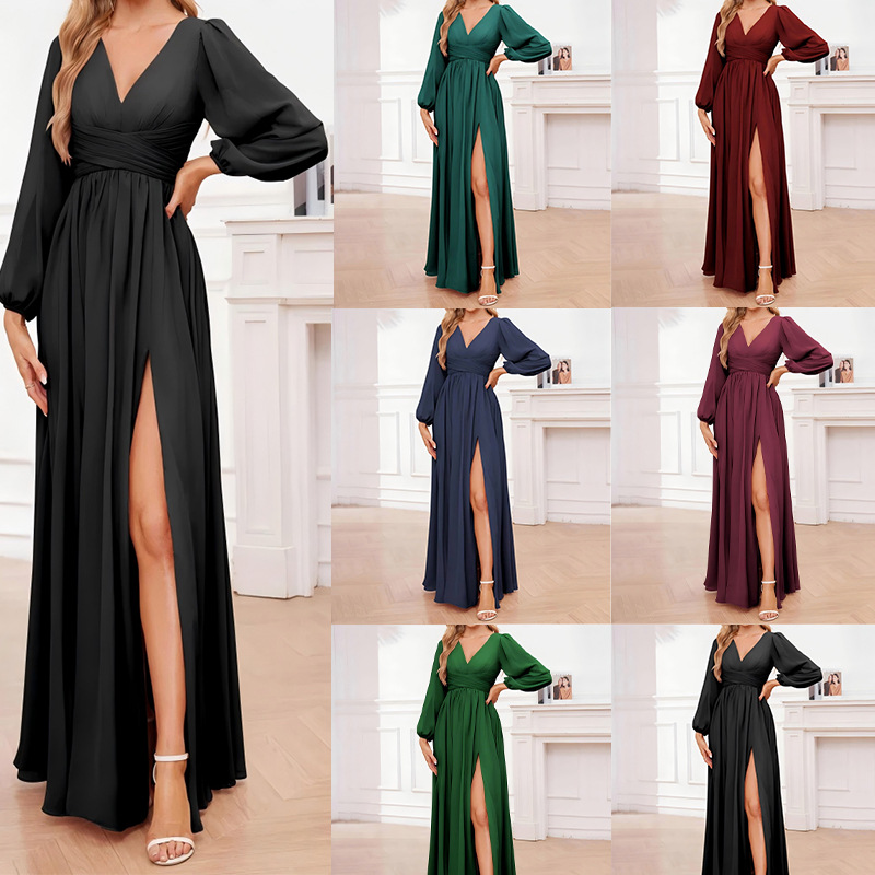 2025秋冬新款欧美跨境纯色v领开叉优雅宴会晚礼服女装连衣裙