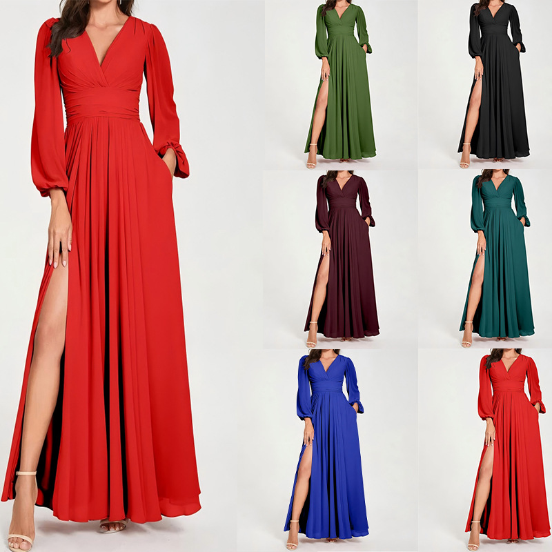 2025秋冬欧美跨境新款纯色v领开叉长袖褶皱优雅女装长款连衣裙