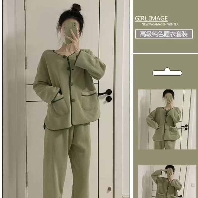 睡衣库【抹茶绿小香风】可外穿珊瑚绒长袖睡衣女套装秋冬季加厚毛