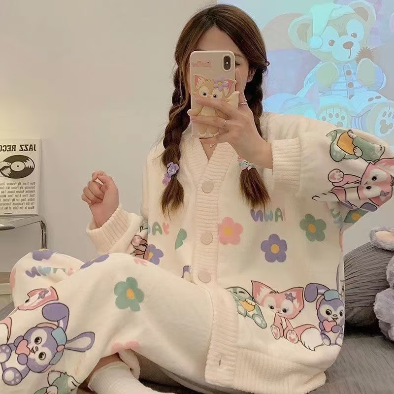 香香家居甜美睡衣女士秋冬季珊瑚绒加厚加绒款法兰绒套装保暖家居