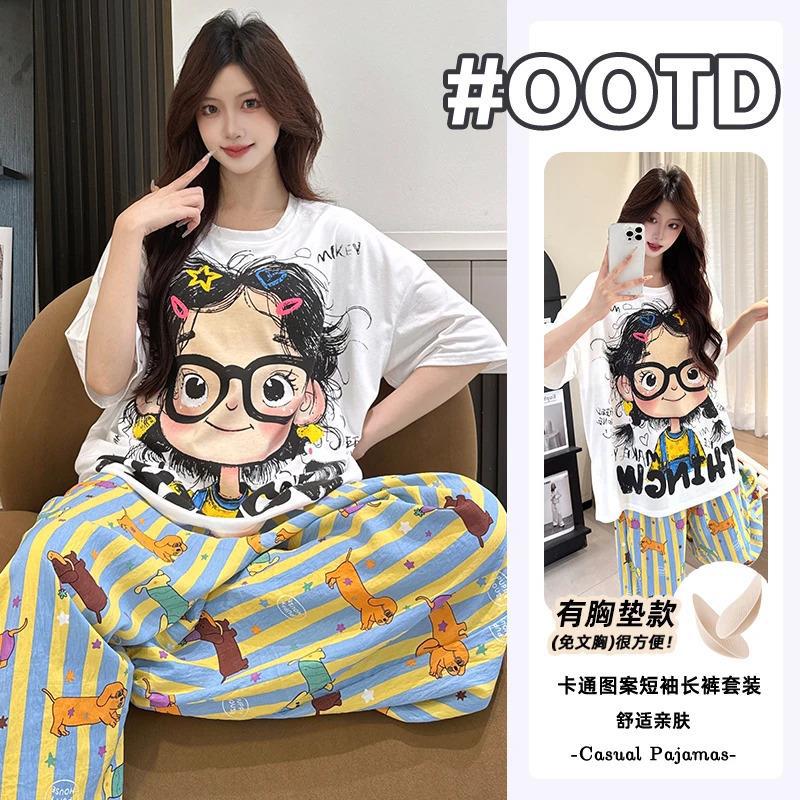 大麦睡衣2025夏季睡衣女士五分袖长裤新款束脚带胸垫家居可外穿