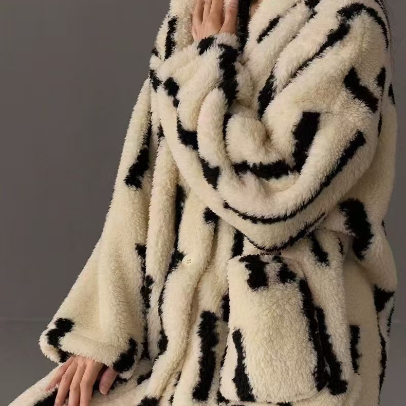 COC波点睡衣女秋冬新款法兰绒家居服珊瑚绒加厚加绒拉链保暖睡衣
