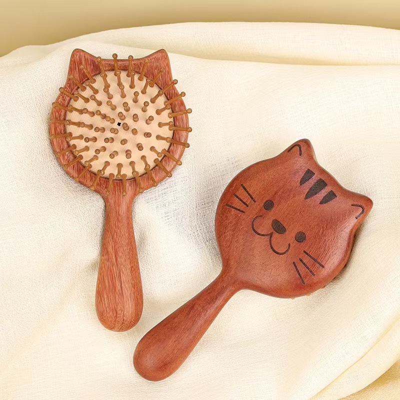 邢粮木艺红檀香木气垫梳可爱小猫气囊梳子实木按摩梳头部经络梳
