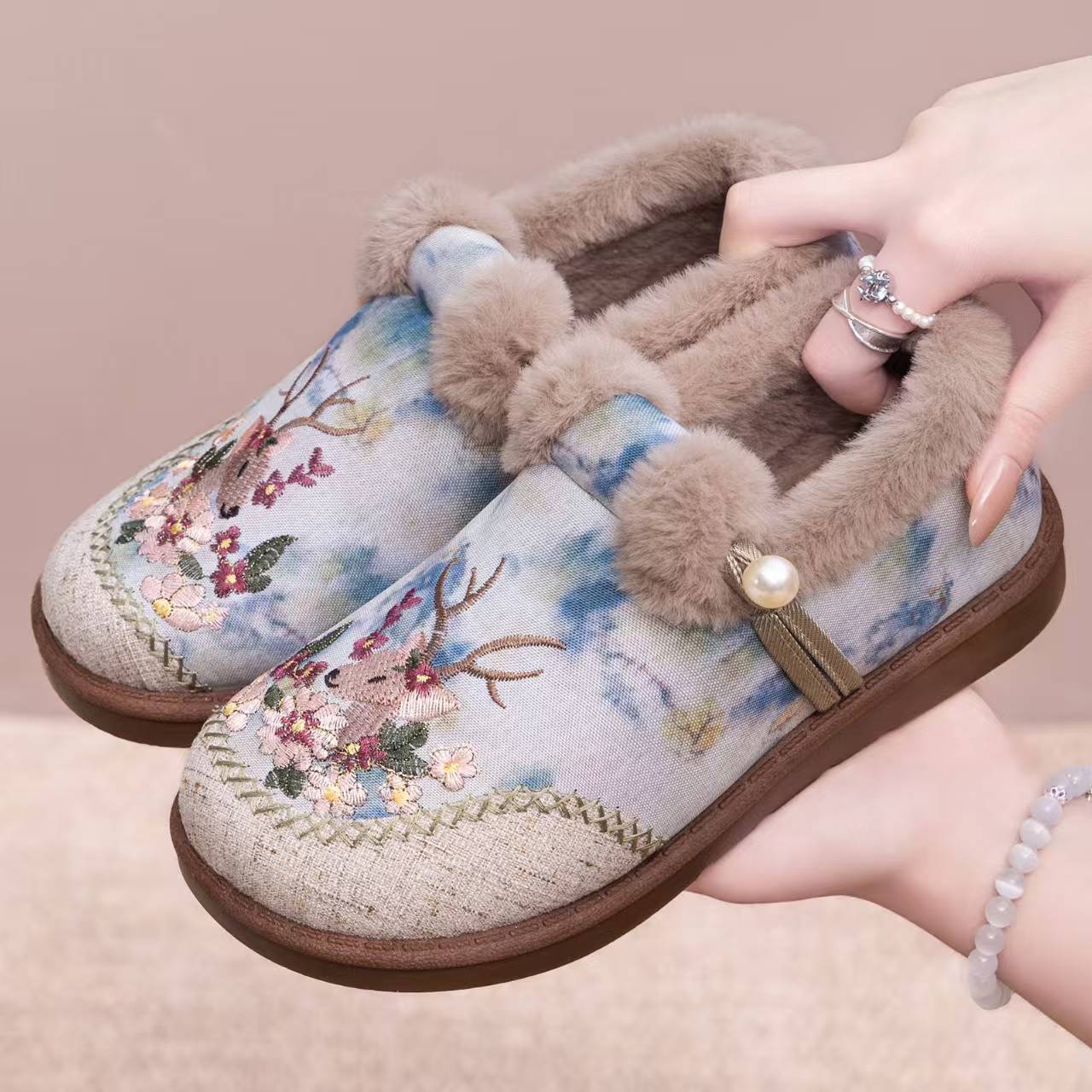 意迪森【一鹿生花】意迪森加绒老北京布鞋厚底棉鞋加宽舒适防滑软