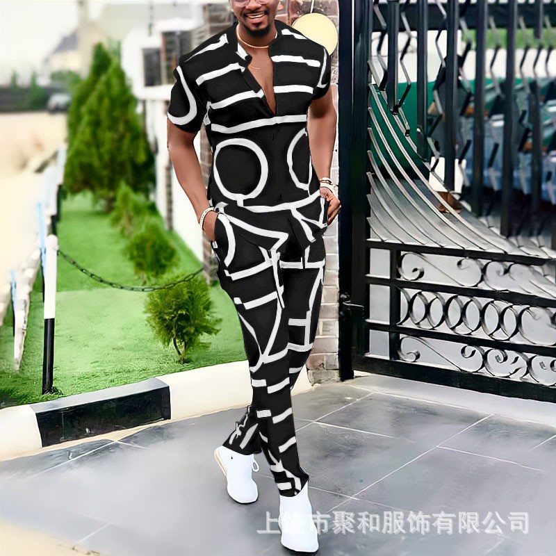 2025夏季新款非洲男士时尚套装跨境热销爆款3D数码印花衬衫套装..