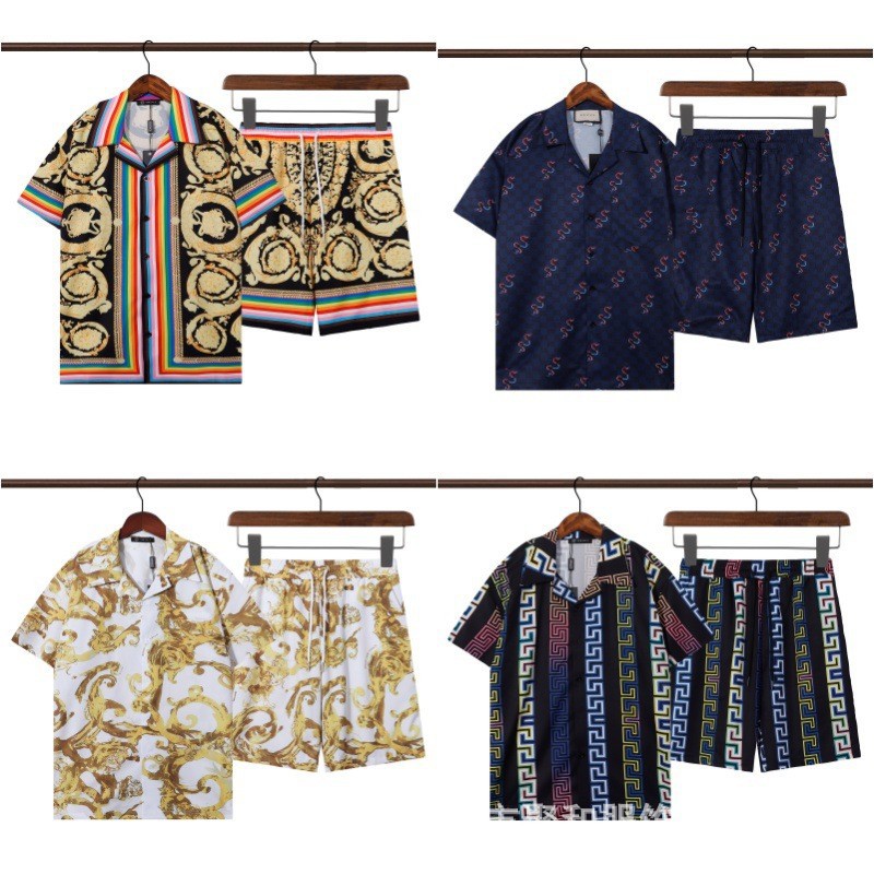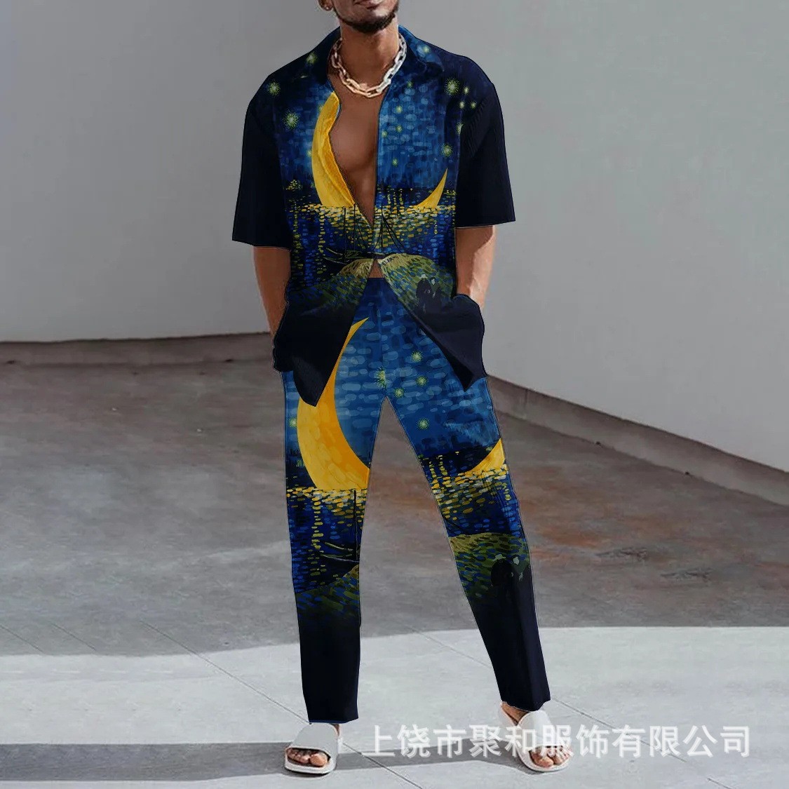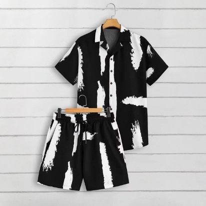 新款欧美跨境外贸时尚青年流行数码印花男士短袖衬衫衬衣短裤套装