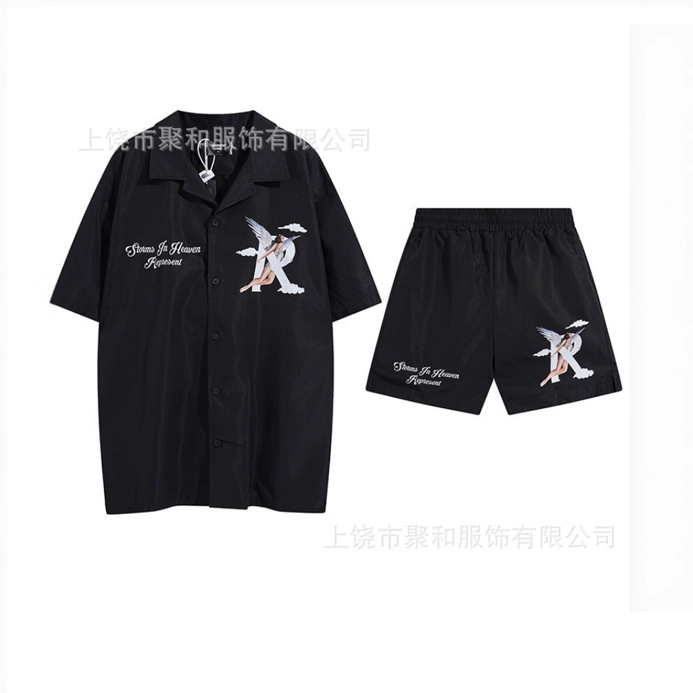 跨境欧美潮牌sp5de星星55满印休闲短袖衬衫男女高街衬衣短裤套装.