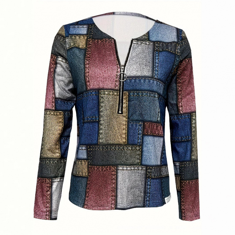 跨境独立站欧美格子印花半拉链T恤Polo衫休闲长袖上衣春秋女装
