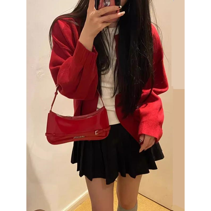 现货jacq**法式真皮小众漆皮亮面复古法棍腋下高级感红色单肩婚包