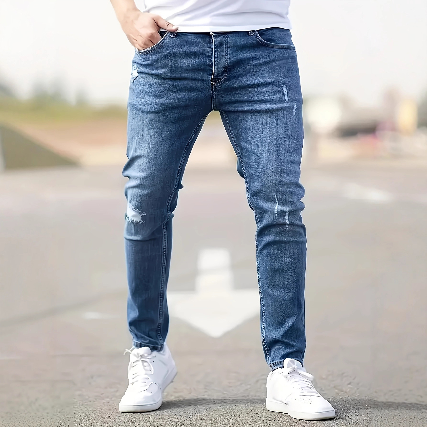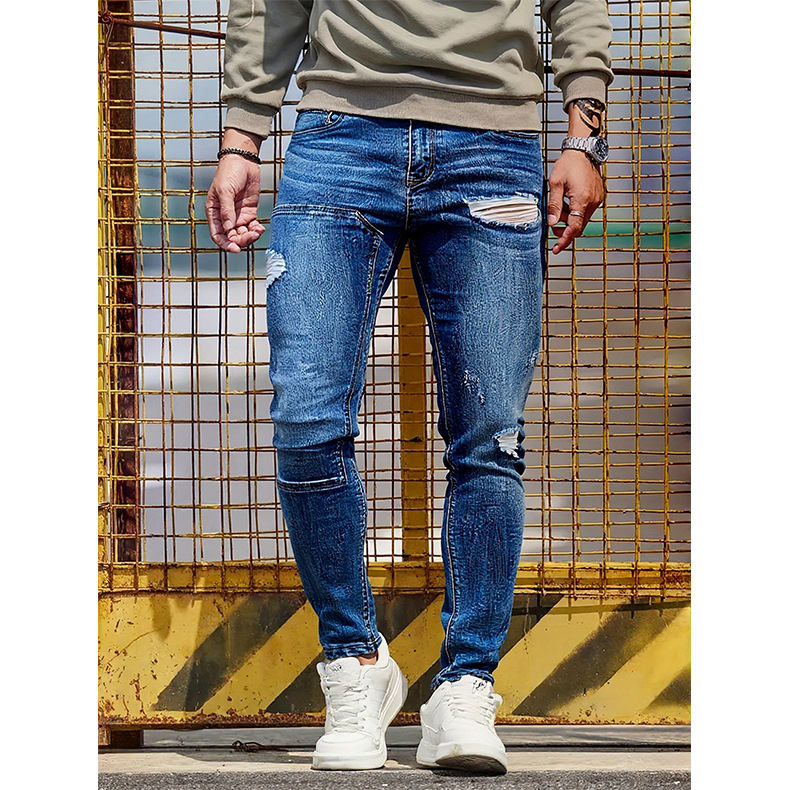 欧美高街男士修身小脚磨烂牛仔长裤潮款青年破洞长裤Temu独立站