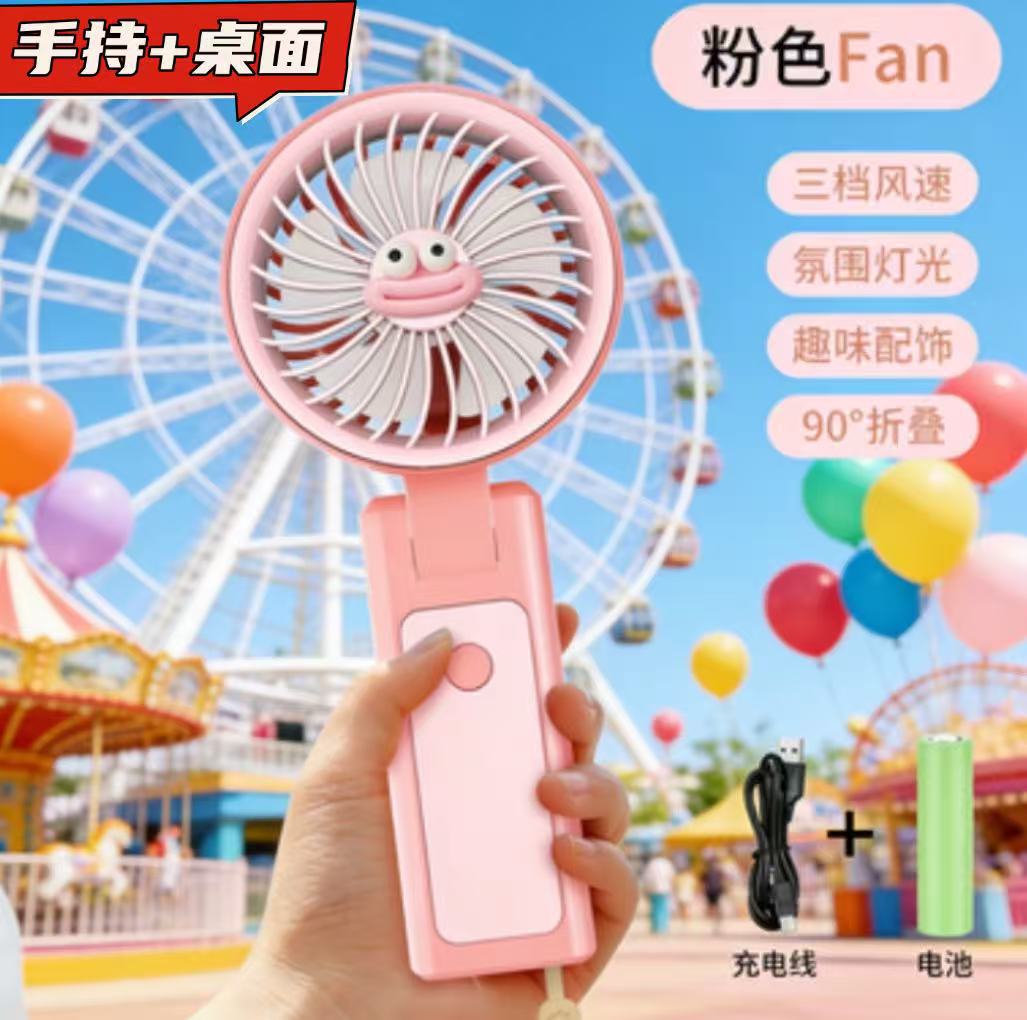 新款折叠风扇三档USB充电带氛围灯光桌面便携手持风扇批发卡通