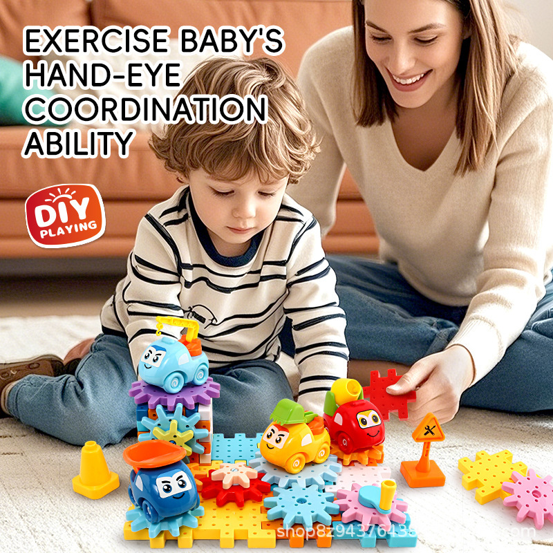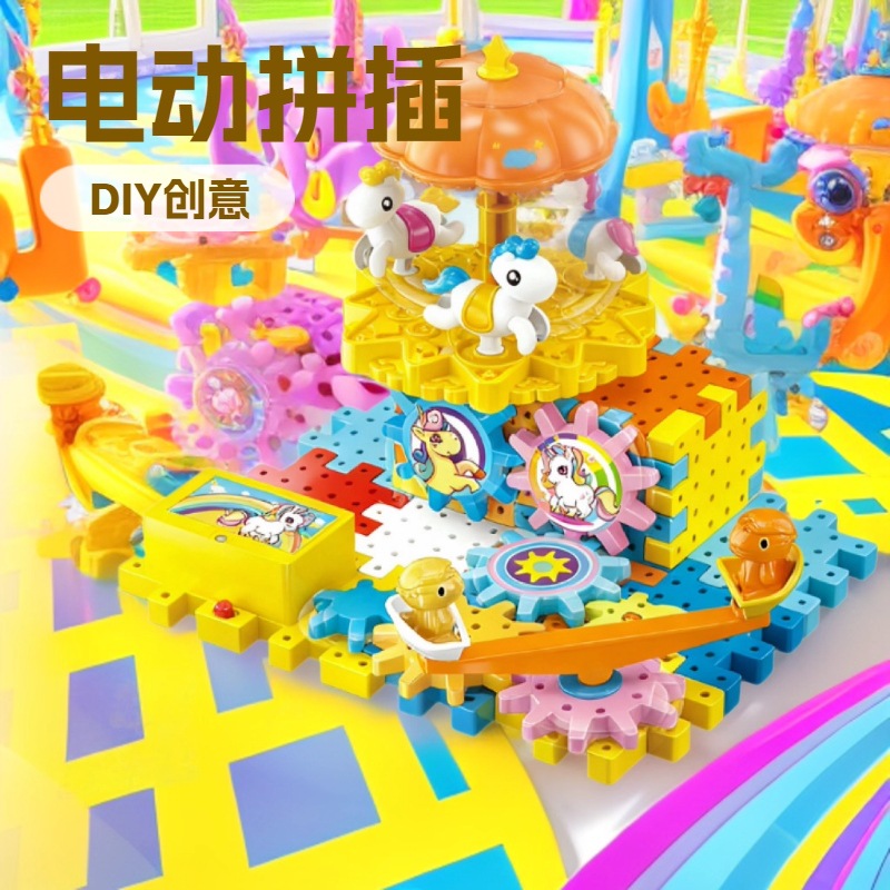 跨境儿童益智齿轮拼插积木旋转木马工程车电动拼装玩具批发手工拼