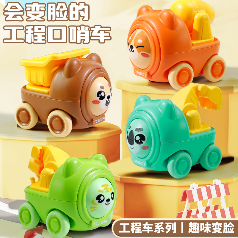 外贸儿童惯性变脸口哨工程卡通车婴儿亲子互动玩具益智滑行变脸