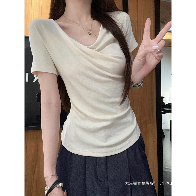 跨境实拍短袖T恤夏2025新款设计感简约纯色修身短款荡领上衣韩版