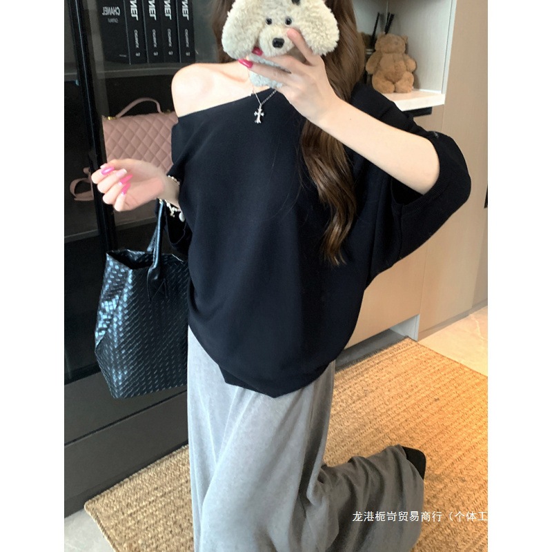 跨境夏珍 法式性感一字肩荡领斜肩短袖T恤2025夏季女纯欲辣妹露肩