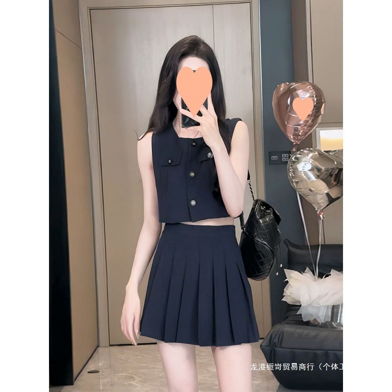 跨境韩版小香风套装裙女2024新款时尚无袖背心上衣高腰百褶短裙两