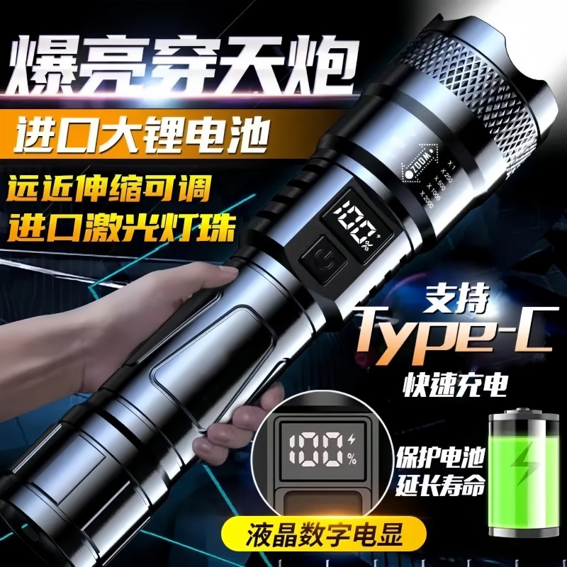 2025新款特种兵90手电筒大光圈强光可充电应急远射超亮超长续航.