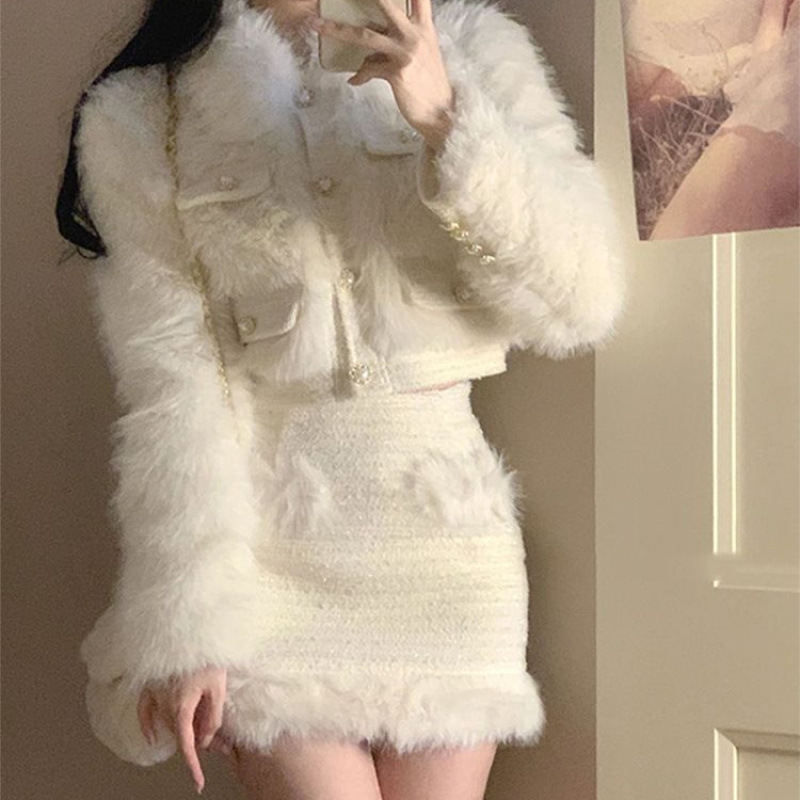 法式小香风加厚毛毛外套短裙时尚套装女秋冬季新款温柔两件套女