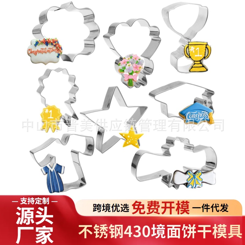 8件毕业季套装不锈钢饼干模具祝福框奖章奖杯按压式烘焙工具跨境