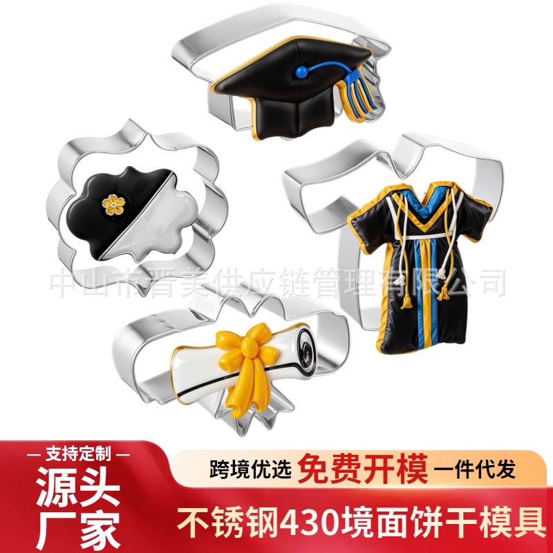 4件毕业季套装不锈钢饼干模具毕业帽学士服按压式烘焙工具diy跨境