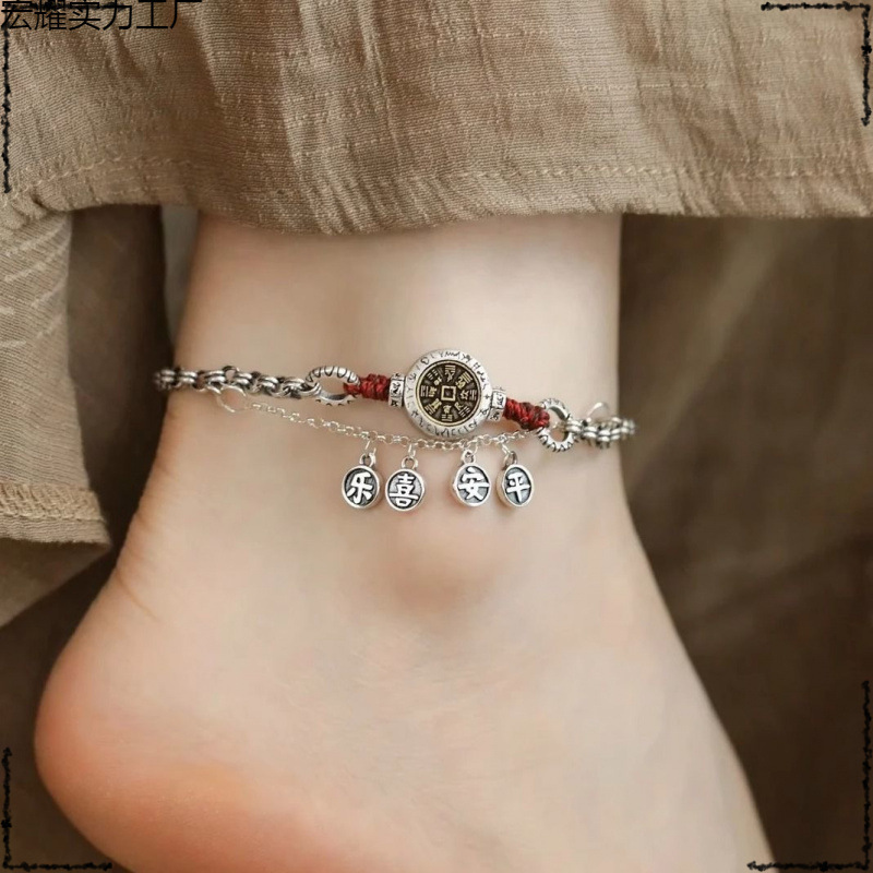 一步一平安一步一喜乐山鬼花钱红绳脚链女复古流苏吊坠铜钱脚踝链