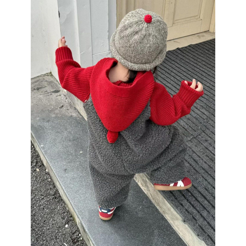 儿童冬季灰色羊羔绒夹棉背带连身裤2025秋冬新款红色毛球连帽毛衣