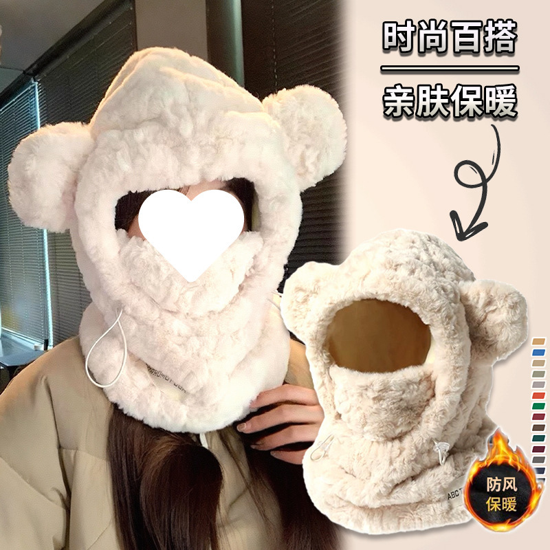 冬季潮款可爱加厚毛绒小熊帽子口罩围巾一体帽子女骑行保暖套头帽