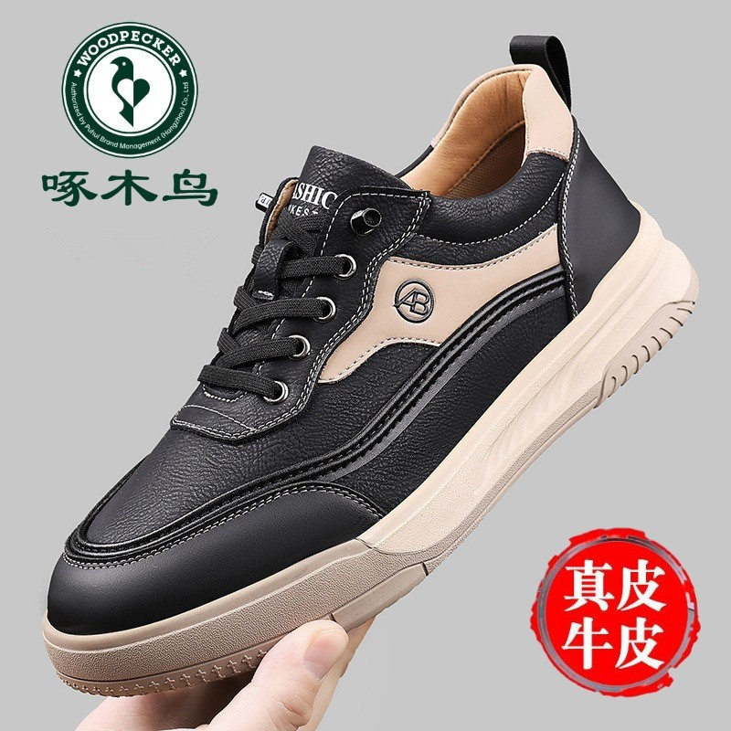 啄木鸟男鞋2025春秋新款真皮休闲中年男士真皮系带防滑运动皮鞋潮