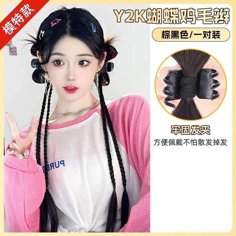 y2k假发辫子女抓夹鸡毛毽子头蝴蝶结拳击辫双马尾多巴胺子甜酷